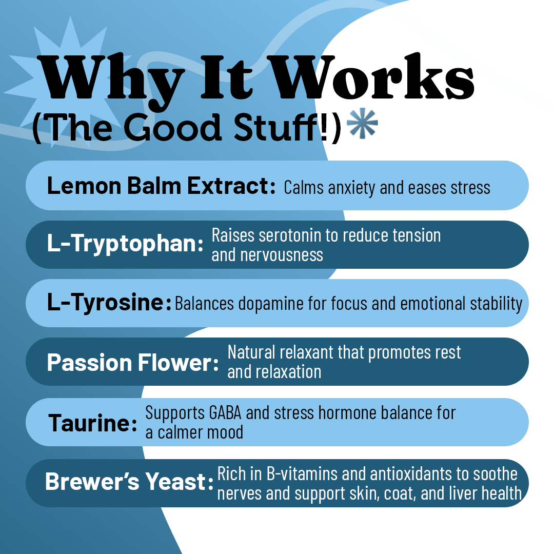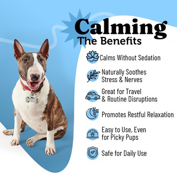 Help your dog stay calm during stressful situations like fireworks, separation, car rides, or thunderstorms - without drowsiness or sedation. Our calming supplement uses a gentle blend of natural, vet-reviewed ingredients to reduce anxiety, support relaxation, and promote balanced behaviour.